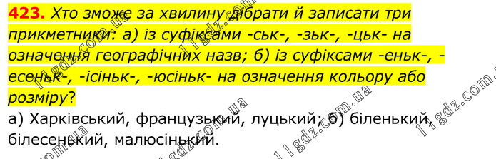 Хто зможе за хвилину дібрати й записати три прикметники: а) із суфіксами -ськ-, -зьк-, -цьк- на означення географічних назв; б) із суфіксами -еньк-, -есеньк-, -ісіньк-, -юсіньк- на означення кольору або розміру? а) Харківський, французький, луцький; б) біленький, білесенький, малюсінький.
