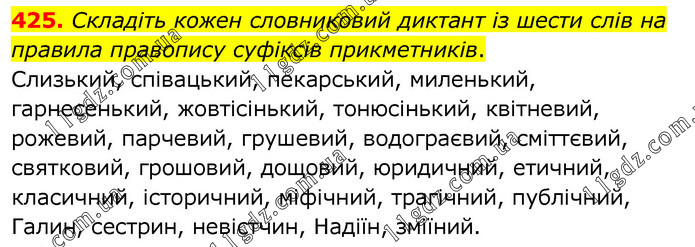 Складіть кожен словниковий диктант із шести слів на правила правопису суфіксів прикметників. Слизький, співацький, пекарський, миленький, гарнесенький, жовтісінький, тонюсінький, квітневий, рожевий, парчевий, грушевий, водограєвий, сміттєвий, святковий, грошовий, дощовий, юридичний, етичний, класичний, історичний, міфічний, трагічний, публічний, Галин, сестрин, невістчин, Надіїн, зміїний.