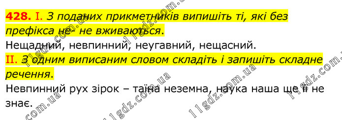 І. З поданих прикметників випишіть ті, які без префікса не- не вживаються. Нещадний, невпинний, неугавний, нещасний. ІІ. З одним виписаним словом складіть і запишіть складне речення. Невпинний рух зірок – таїна неземна, наука наша ще її не знає.