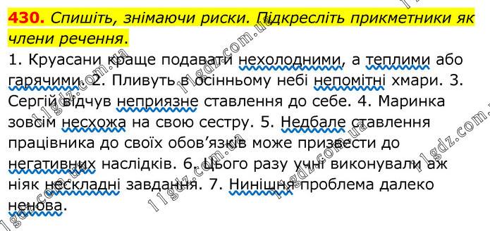 Спишіть, знімаючи риски. Підкресліть прикметники як члени речення. 1. Круасани краще подавати нехолодними, а теплими або гарячими. 2. Пливуть в осінньому небі непомітні хмари. 3. Сергій відчув неприязне ставлення до себе. 4. Маринка зовсім несхожа на свою сестру. 5. Недбале ставлення працівника до своїх обов’язків може призвести до негативних наслідків. 6. Цього разу учні виконували аж ніяк нескладні завдання. 7. Нинішня проблема далеко ненова.