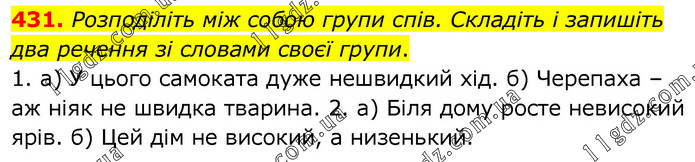 Розподіліть між собою групи спів. Складіть і запишіть два речення зі словами своєї групи. 1. а) У цього самоката дуже нешвидкий хід. б) Черепаха – аж ніяк не швидка тварина. 2. а) Біля дому росте невисокий ярів. б) Цей дім не високий, а низенький.