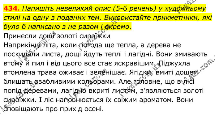 Напишіть невеликий опис (5-6 речень) у художньому стилі на одну з поданих тем. Використайте прикметники, які було б написано з не разом і окремо. Принесли дощі золоті сироїжки Наприкінці літа, коли погода ще тепла, а дерева не поскидали листа, дощі йдуть теплі і лагідні. Вони змивають втому й пил і від цього все стає яскравішим. Піджухла втомлена трава оживає і зеленішає. Ягідки, вмиті дощем блищать звабливими кольорами. Але головне, що в лісі попід деревами, лагідно вкриті листям, з’являються золоті сироїжки. І ліс наповнюється їх свіжим ароматом. Вони сповіщають про прихід осені.