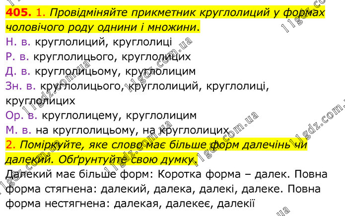 1. Провідміняйте прикметник круглолиций у формах чоловічого роду однини і множини. Н. в. круглолиций, круглолиці Р. в. круглолицього, круглолицих Д. в. круглолицьому, круглолицим Зн. в. круглолицього, круглолиций, круглолиці, круглолицих Ор. в. круглолицему, круглолицим М. в. на круглолицьому, на круглолицих 2. Поміркуйте, яке слово має більше форм далечінь чи далекий. Обґрунтуйте свою думку. Далекий має більше форм: Коротка форма – далек. Повна форма стягнена: далекий, далека, далекі, далеке. Повна форма нестягнена: далекая, далекеє, далекії.