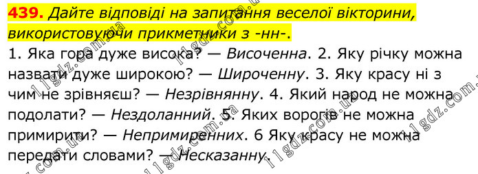 Дайте відповіді на запитання веселої вікторини, використовуючи прикметники з -нн-. 1. Яка гора дуже висока? — Височенна. 2. Яку річку можна назвати дуже широкою? — Широченну. 3. Яку красу ні з чим не зрівняєш? — Незрівнянну. 4. Який народ не можна подолати? — Нездоланний. 5. Яких ворогів не можна примирити? — Непримиренних. 6 Яку красу не можна передати словами? — Несказанну.