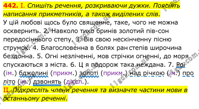 І. Спишіть речення, розкриваючи дужки. Поясніть написання прикметників, а також виділених слів. У цій любові щось було священне, таке, чого не можна осквернить. 2. Навколо тихо бринів золотий півсон передосіннього степу. 3. Вів свою нескінченну пісню струмок. 4. Благословенна в болях ран степів широчина бездонна. 5. Огні незліченні, мов стрічки огненні, до моря спускаються з міста. 6. Ц я подорож така неждана. 7. Рої (ім.) бджолині (прикм.) золоті (прикм.) над річкою (ім.) про літо (ім.) дзвонять (дієсл.). ІІ. Підкресліть члени речення та визначте частини мови в останньому реченні.