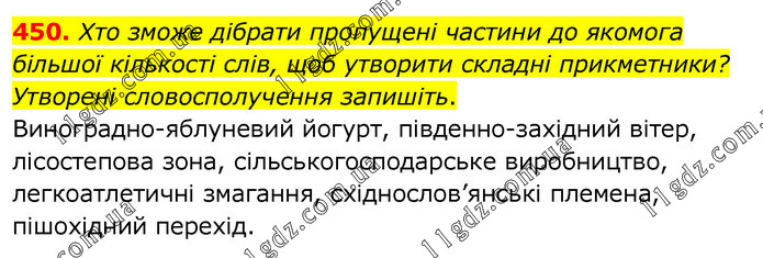Хто зможе дібрати пропущені частини до якомога більшої кількості слів, щоб утворити складні прикметники? Утворені словосполучення запишіть. Виноградно-яблуневий йогурт, південно-західний вітер, лісостепова зона, сільськогосподарське виробництво, легкоатлетичні змагання, східнослов’янські племена, пішохідний перехід.