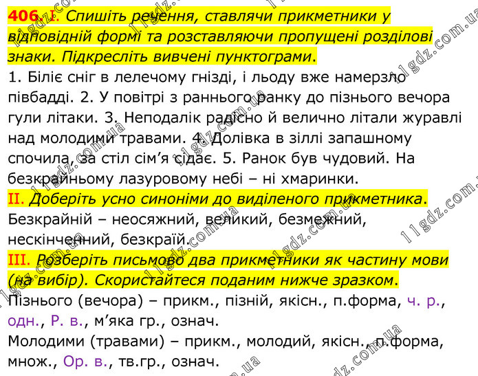 І. Спишіть речення, ставлячи прикметники у відповідній формі та розставляючи пропущені розділові знаки. Підкресліть вивчені пунктограми. 1. Біліє сніг в лелечому гнізді, і льоду вже намерзло півбадді. 2. У повітрі з раннього ранку до пізнього вечора гули літаки. 3. Неподалік радісно й велично літали журавлі над молодими травами. 4. Долівка в зіллі запашному спочила, за стіл сім’я сідає. 5. Ранок був чудовий. На безкрайньому лазуровому небі – ні хмаринки. ІІ. Доберіть усно синоніми до виділеного прикметника. Безкрайній – неосяжний, великий, безмежний, нескінченний, безкраїй. ІІІ. Розберіть письмово два прикметники як частину мови (на вибір). Скористайтеся поданим нижче зразком. Пізнього (вечора) – прикм., пізній, якісн., п.форма, ч. р., одн., Р. в., м’яка гр., означ. Молодими (травами) – прикм., молодий, якісн., п.форма, множ., Ор. в., тв.гр., означ.