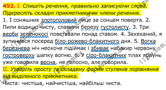 І. Спишіть речення, правильно записуючи слова. Підкресліть складні прикметники як члени речення. 1. І соняшник злотоголовий лице за сонцем поверта. 2. Пили водицю чисту, славили березу густолисту. 3. Три верби зеленокосі повставали понад ставом. 4. Захеканий, я зупинився посеред біло-рожево-блакитного дня. 5. Вогка березнева ніч неохоче підіймає і збиває набакир червону гостроверху шапку вогню. 6. У сіро-блакитних тілах яблунь уже говорила весна, не голосно, але говорила. ІІ. Утворіть просту та складену форми ступенів порівняння від виділеного прикметника. Чиста: чистіша, найчистіша, найбільш чиста.