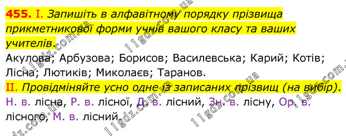 І. Запишіть в алфавітному порядку прізвища прикметникової форми учнів вашого класу та ваших учителів. Акулова; Арбузова; Борисов; Василевська; Карий; Котів; Лісна; Лютиків; Миколаєв; Таранов. ІІ. Провідміняйте усно одне із записаних прізвищ (на вибір). Н. в. лісна, Р. в. лісної, Д. в. лісний, Зн. в. лісну, Ор. в. лісного, М. в. лісний.