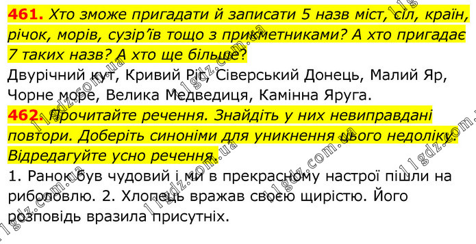 461. Хто зможе пригадати й записати 5 назв міст, сіл, країн, річок, морів, сузір’їв тощо з прикметниками? А хто пригадає 7 таких назв? А хто ще більше? Двурічний кут, Кривий Ріг, Сіверський Донець, Малий Яр, Чорне море, Велика Медведиця, Камінна Яруга. 462. Прочитайте речення. Знайдіть у них невиправдані повтори. Доберіть синоніми для уникнення цього недоліку. Відредагуйте усно речення. 1. Ранок був чудовий і ми в прекрасному настрої пішли на риболовлю. 2. Хлопець вражав своєю щирістю. Його розповідь вразила присутніх.