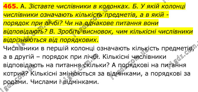 А. Зіставте числівники в колонках. Б. У якій колонці числівники означають кількість предметів, а в якій - порядок при лічбі? Чи на однакове питання вони відповідають? В. Зробіть висновок, чим кількісні числівники відрізняються від порядкових. Числівники в першій колонці означають кількість предметів, а в другій – порядок при лічбі. Кількісні числівники відповідають на питання скільки? А порядкові на питання котрий? Кількісні змінюються за відмінками, а порядкові за родами. Числами і відмінками.
