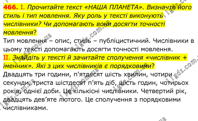 І. Прочитайте текст «НАША ПЛАНЕТА». Визначте його стиль і тип мовлення. Яку роль у тексті виконують числівники? Чи допомагають вони досягти точності мовлення? Тип мовлення – опис, стиль – публіцистичний. Числівники в цьому тексті допомагають досягти точності мовлення. ІІ. Знайдіть у тексті й зачитайте сполучення «числівник + іменник». Які з цих числівників є порядковими? Двадцять три години, п’ятдесят шість хвилин, чотири секунди, триста шістдесят п’ять діб, шість годин, чотирьох років, однієї доби. Це кількісні числівники. Четвертий рік, двадцять дев’яте лютого. Це сполучення з порядковими числівниками.