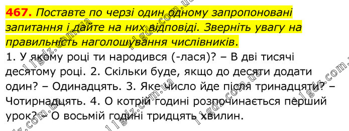 Поставте по черзі один одному запропоновані запитання і дайте на них відповіді. Зверніть увагу на правильність наголошування числівників. 1. У якому році ти народився (-лася)? – В дві тисячі десятому році. 2. Скільки буде, якщо до десяти додати один? – Одинадцять. 3. Яке число йде після тринадцяти? – Чотирнадцять. 4. О котрій годині розпочинається перший урок? – О восьмій годині тридцять хвилин.