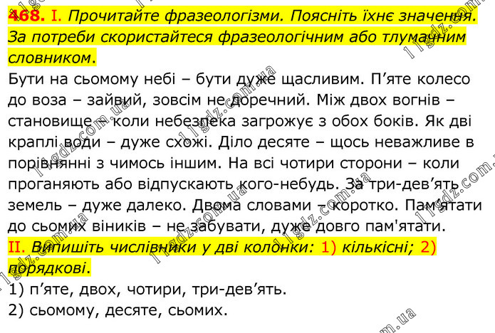 І. Прочитайте фразеологізми. Поясніть їхнє значення. За потреби скористайтеся фразеологічним або тлумачним словником. Бути на сьомому небі – бути дуже щасливим. П’яте колесо до воза – зайвий, зовсім не доречний. Між двох вогнів – становище – коли небезпека загрожує з обох боків. Як дві краплі води – дуже схожі. Діло десяте – щось неважливе в порівнянні з чимось іншим. На всі чотири сторони – коли проганяють або відпускають кого-небудь. За тридев’ять земель – дуже далеко. Двома словами – коротко. Пам’ятати до сьомих віників – не забувати, дуже довго пам'ятати. II. Випишіть числівники у дві колонки: 1) кількісні; 2) порядкові. 1) п’яте, двох, чотири, тридев’ять. 2) сьомому, десяте, сьомих.