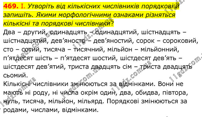 І. Утворіть від кількісних числівників порядкові й запишіть. Якими морфологічними ознаками різняться кількісні та порядкові числівники? Два – другий, одинадцять – одинадцятий, шістнадцять – шістнадцятий, дев’яносто – дев’яностий, сорок – сороковий, сто – сотий, тисяча – тисячний, мільйон – мільйонний, п’ятдесят шість – п’ятдесят шостий, шістдесят дев’ять – шістдесят дев’ятий, триста двадцять сім – триста двадцять сьомий. Кількісні числівники змінюються за відмінками. Вони не мають ні роду, ні числа окрім один, два, обидва, півтора, нуль, тисяча, мільйон, мільярд. Порядкові змінюються за родами, числами, відмінками.