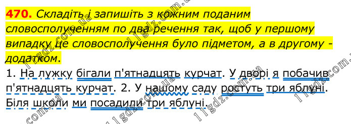Складіть і запишіть з кожним поданим словосполученням по два речення так, щоб у першому випадку це словосполучення було підметом, а в другому - додатком. 1. На лужку бігали п'ятнадцять курчат. У дворі я побачив п'ятнадцять курчат. 2. У нашому саду ростуть три яблуні. Біля школи ми посадили три яблуні.