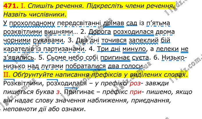 І. Спишіть речення. Підкресліть члени речення. Назвіть числівники. У прохолодному передсвітанні дрімав сад із п’ятьма розквітлими вишнями… 2. Дорога розходилася двома чорними рукавами. 3. Два дні точився запеклий бій карателів із партизанами. 4. Три дні минуло, а лелеки не з’явились. 5. Сьоме небо собі пригинає суєта. 6. Низько-низько над лугами побраталися два голоси. ІІ. Обґрунтуйте написання префіксів у виділених словах. Розквітлими, розходилася – у префіксі роз- завжди пишеться буква з. Пригинає – префікс при- пишемо, якщо він надає слову значення наближення, приєднання, неповноти дії або ознаки.