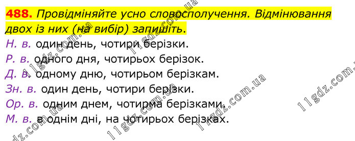 Провідміняйте усно словосполучення. Відмінювання двох із них (на вибір) запишіть. Н. в. один день, чотири берізки. Р. в. одного дня, чотирьох берізок. Д. в. одному дню, чотирьом берізкам. Зн. в. один день, чотири берізки. Ор. в. одним днем, чотирма берізками. М. в. в однім дні, на чотирьох берізках.