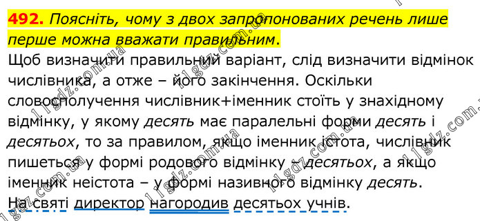Поясніть, чому з двох запропонованих речень лише перше можна вважати правильним. Щоб визначити правильний варіант, слід визначити відмінок числівника, а отже – його закінчення. Оскільки словосполучення числівник+іменник стоїть у знахідному відмінку, у якому десять має паралельні форми десять і десятьох, то за правилом, якщо іменник істота, числівник пишеться у формі родового відмінку – десятьох, а якщо іменник неістота – у формі називного відмінку десять. На святі директор нагородив десятьох учнів.