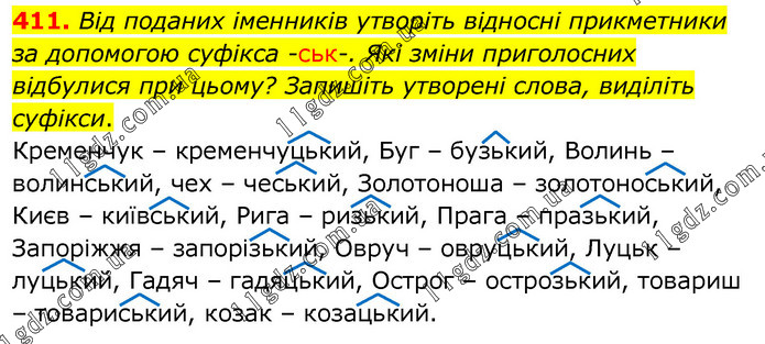 Від поданих іменників утворіть відносні прикметники за допомогою суфікса -ськ-. Які зміни приголосних відбулися при цьому? Запишіть утворені слова, виділіть суфікси. Кременчук – кременчуцький, Буг – бузький, Волинь – волинський, чех – чеський, Золотоноша – золотоноський, Києв – київський, Рига – ризький, Прага – празький, Запоріжжя – запорізький, Овруч – овруцький, Луцьк – луцький, Гадяч – гадяцький, Острог – острозький, товариш – товариський, козак – козацький.