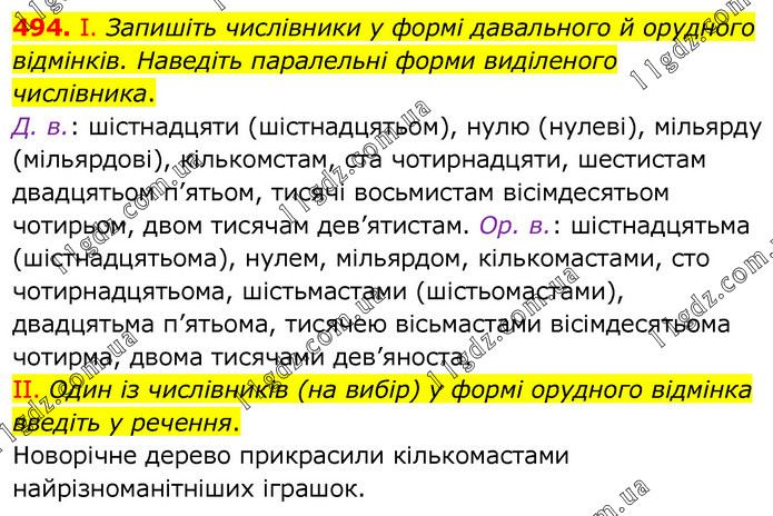 І. Запишіть числівники у формі давального й орудного відмінків. Наведіть паралельні форми виділеного числівника. Д. в.: шістнадцяти (шістнадцятьом), нулю (нулеві), мільярду (мільярдові), кількомстам, ста чотирнадцяти, шестистам двадцятьом п’ятьом, тисячі восьмистам вісімдесятьом чотирьом, двом тисячам дев’ятистам. Ор. в.: шістнадцятьма (шістнадцятьома), нулем, мільярдом, кількомастами, сто чотирнадцятьома, шістьмастами (шістьомастами), двадцятьма п’ятьома, тисячею вісьмастами вісімдесятьома чотирма, двома тисячами дев’яноста. ІІ. Один із числівників (на вибір) у формі орудного відмінка введіть у речення. Новорічне дерево прикрасили кількомастами найрізноманітніших іграшок.