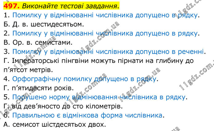 Виконайте тестові завдання. 1. Помилку у відмінюванні числівника допущено в рядку. Б. Д. в. шестидесятьом. 2. Помилку у відмінюванні числівника допущено в рядку. В. Ор. в. семистами. 3. Помилку у відмінюванні числівника допущено в реченні. Г. Імператорські пінгвіни можуть пірнати на глибину до п’ятсот метрів. 4. Орфографічну помилку допущено в рядку. Г. п’ятидесяти років. 5. Порушено норму відмінювання числівника в рядку. Г. від дев’яносто до сто кілометрів. 6. Правильною є відмінкова форма числівника. А. семисот шістдесятьох двох.
