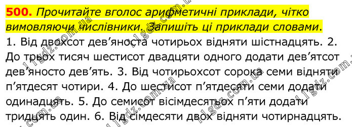 Прочитайте вголос арифметичні приклади, чітко вимовляючи числівники. Запишіть ці приклади словами. 1. Від двохсот дев’яноста чотирьох відняти шістнадцять. 2. До трьох тисяч шестисот двадцяти одного додати дев’ятсот дев’яносто дев’ять. 3. Від чотирьохсот сорока семи відняти п’ятдесят чотири. 4. До шестисот п’ятдесяти семи додати одинадцять. 5. До семисот вісімдесятьох п’яти додати тридцять один. 6. Від сімдесяти двох відняти чотирнадцять.