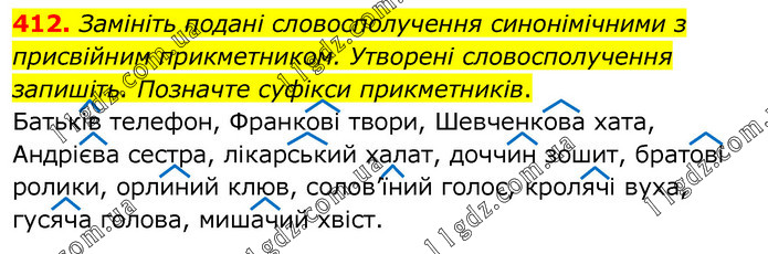 Замініть подані словосполучення синонімічними з присвійним прикметником. Утворені словосполучення запишіть. Позначте суфікси прикметників. Батьків телефон, Франкові твори, Шевченкова хата, Андрієва сестра, лікарський халат, доччин зошит, братові ролики, орлиний клюв, солов’їний голос, кролячі вуха, гусяча голова, мишачий хвіст.