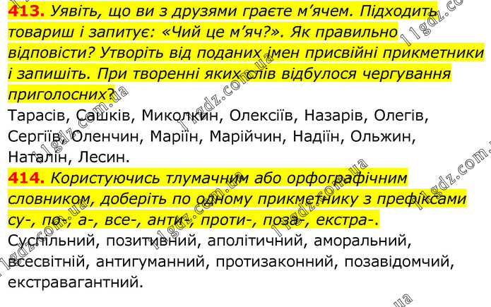 413. Уявіть, що ви з друзями граєте м’ячем. Підходить товариш і запитує: «Чий це м’яч?». Як правильно відповісти? Утворіть від поданих імен присвійні прикметники і запишіть. При творенні яких слів відбулося чергування приголосних? Тарасів, Сашків, Миколкин, Олексіїв, Назарів, Олегів, Сергіїв, Оленчин, Маріїн, Марійчин, Надіїн, Ольжин, Наталін, Лесин. 414. Користуючись тлумачним або орфографічним словником, доберіть по одному прикметнику з префіксами су-, по-, а-, все-, анти-, проти-, поза-, екстра-. Суспільний, позитивний, аполітичний, аморальний, всесвітній, антигуманний, протизаконний, позавідомчий, екстравагантний.