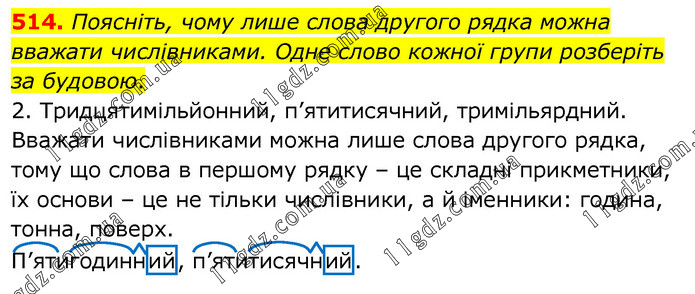 Поясніть, чому лише слова другого рядка можна вважати числівниками. Одне слово кожної групи розберіть за будовою. 2. Тридцятимільйонний, п’ятитисячний, тримільярдний. Вважати числівниками можна лише слова другого рядка, тому що слова в першому рядку – це складні прикметники, їх основи – це не тільки числівники, а й іменники: година, тонна, поверх. П’ятигодинний, п’ятитисячний.