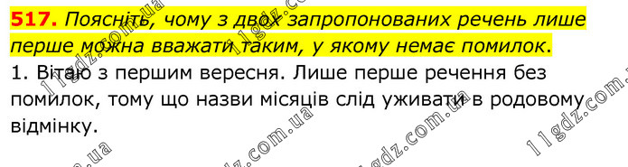 Поясніть, чому з двох запропонованих речень лише перше можна вважати таким, у якому немає помилок. 1. Вітаю з першим вересня. Лише перше речення без помилок, тому що назви місяців слід уживати в родовому відмінку.