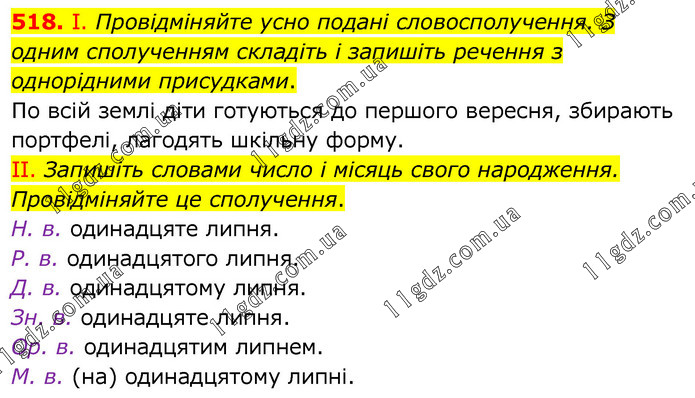 І. Провідміняйте усно подані словосполучення. З одним сполученням складіть і запишіть речення з однорідними присудками. По всій землі діти готуються до першого вересня, збирають портфелі, лагодять шкільну форму. ІІ. Запишіть словами число і місяць свого народження. Провідміняйте це сполучення. Н. в. одинадцяте липня. Р. в. одинадцятого липня. Д. в. одинадцятому липня. Зн. в. одинадцяте липня. Ор. в. одинадцятим липнем. М. в. (на) одинадцятому липні.