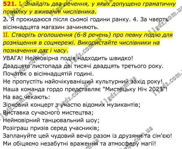 І. Знайдіть два речення, у яких допущено граматичну помилку у вживанні числівника. 2. Я прокидаюся після сьомої години ранку. 4. За чверть вісімнадцята магазин зачиняють. II. Створіть оголошення (6-8 речень) про певну подію для розміщення в соцмережі. Використайте числівники на позначення дат і часу. УВАГА! Неймовірна подія надходить швидко! Двадцяте листопада дві тисячі двадцять третього року. Початок о вісімнадцятій годині. Не пропустіть найочікуваніший культурний захід року! Наша команда гордо представляє "Мистецьку Ніч 2023"! На вас чекають: Зірковий концерт з участю відомих музикантів; Виставка сучасного мистецтва; Неймовірний танцювальний шоу; Розіграш призів серед учасників; Заплануйте цей чудовий вечір разом із друзями та сім'єю! Ми обіцяємо незабутні враження та атмосферу магії!
