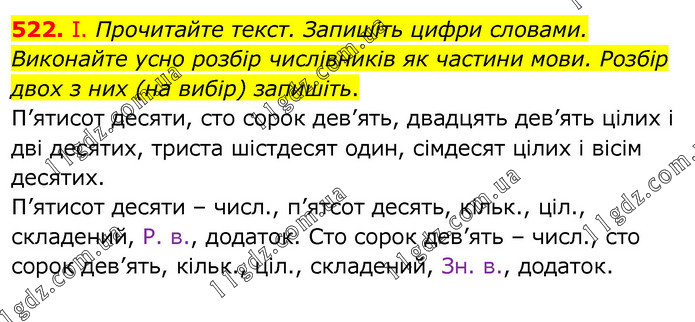 І. Прочитайте текст. Запишіть цифри словами. Виконайте усно розбір числівників як частини мови. Розбір двох з них (на вибір) запишіть. П’ятисот десяти, сто сорок дев’ять, двадцять дев’ять цілих і дві десятих, триста шістдесят один, сімдесят цілих і вісім десятих. П’ятисот десяти – числ., п’ятсот десять, кільк., ціл., складений, Р. в., додаток. Сто сорок дев’ять – числ., сто сорок дев’ять, кільк., ціл., складений, Зн. в., додаток.