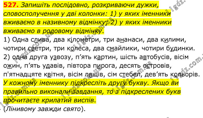 Запишіть послідовно, розкриваючи дужки, словосполучення у дві колонки: 1) у яких іменники вживаємо в називному відмінку; 2) у яких іменники вживаємо в родовому відмінку. 1) Одна слива, два кілометри, три ананаси, два килими, чотири светри, три колеса, два смайлики, чотири будинки. 2) одна друга узвозу, п’ять картин, шість автобусів, вісім ожин, п’ять удавів, півтора пирога, десять островів, п'ятнадцяте квітня, вісім лящів, сім стебел, дев’ять кольорів. У кожному іменнику підкресліть другу букву. Якщо ви правильно виконали завдання, то з підкреслених букв прочитаєте крилатий виспів. (Лінивому завжди свято).