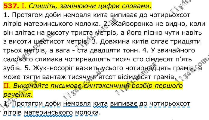 І. Спишіть, замінюючи цифри словами. 1. Протягом доби немовля кита випиває до чотирьохсот літрів материнського молока. 2. Жайворонка не видно, коли він злітає на висоту триста метрів, а його пісню чути навіть з висоти шестисот метрів. 3. Довжина китів сягає тридцяти трьох метрів, а вага - ста двадцяти тонн. 4. У звичайного садового слимака чотирнадцять тисяч сто сімдесят п’ять зубів. 5. Жук-носоріг важить усього чотирнадцять грамів, а може тягти вантаж тисячу п’ятсот вісімдесят грамів. ІІ. Виконайте письмово синтаксичний розбір першого речення. 1. Протягом доби немовля кита випиває до чотирьохсот літрів материнського молока.