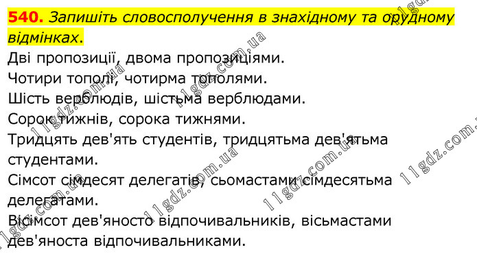 Запишіть словосполучення в знахідному та орудному відмінках. Дві пропозиції, двома пропозиціями. Чотири тополі, чотирма тополями. Шість верблюдів, шістьма верблюдами. Сорок тижнів, сорока тижнями. Тридцять дев'ять студентів, тридцятьма дев'ятьма студентами. Сімсот сімдесят делегатів, сьомастами сімдесятьма делегатами. Вісімсот дев'яносто відпочивальників, вісьмастами дев'яноста відпочивальниками.