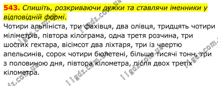 Спишіть, розкриваючи дужки та ставлячи іменники у відповідній формі. Чотири альпініста, три фахівця, два олівця, тридцять чотири міліметрів, півтора кілограма, одна третя розчина, три шостих гектара, вісімсот два ліхтаря, три із чвертю апельсинів, сорок чотири бюлетені, більше тисячі тонн, три з половиною дня, півтора кілометра, після двох третіх кілометра.