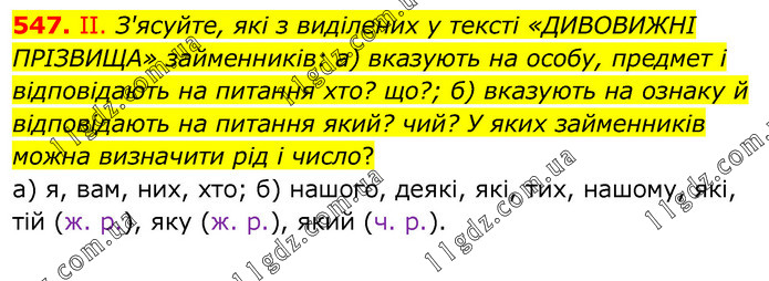 ІІ. З'ясуйте, які з виділених у тексті «ДИВОВИЖНІ ПРІЗВИЩА» займенників: а) вказують на особу, предмет і відповідають на питання хто? що?; б) вказують на ознаку й відповідають на питання який? чий? У яких займенників можна визначити рід і число? а) я, вам, них, хто; б) нашого, деякі, які, тих, нашому, які, тій (ж. р.), яку (ж. р.), який (ч. р.).