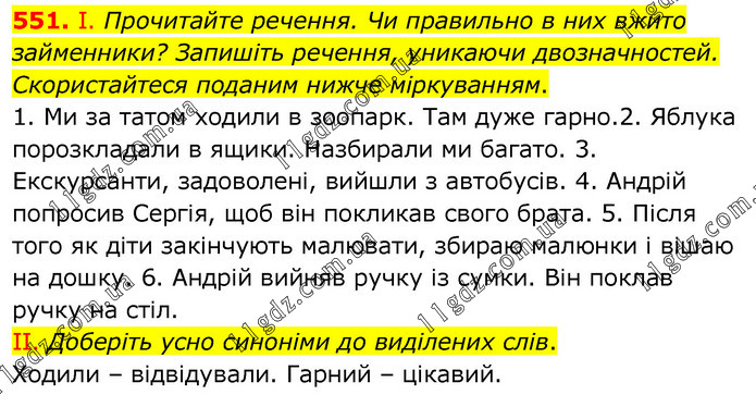 І. Прочитайте речення. Чи правильно в них вжито займенники? Запишіть речення, уникаючи двозначностей. Скористайтеся поданим нижче міркуванням. 1. Ми за татом ходили в зоопарк. Там дуже гарно.2. Яблука порозкладали в ящики. Назбирали ми багато. 3. Екскурсанти, задоволені, вийшли з автобусів. 4. Андрій попросив Сергія, щоб він покликав свого брата. 5. Після того як діти закінчують малювати, збираю малюнки і вішаю на дошку. 6. Андрій вийняв ручку із сумки. Він поклав ручку на стіл. ІІ. Доберіть усно синоніми до виділених слів. Ходили – відвідували. Гарний – цікавий.