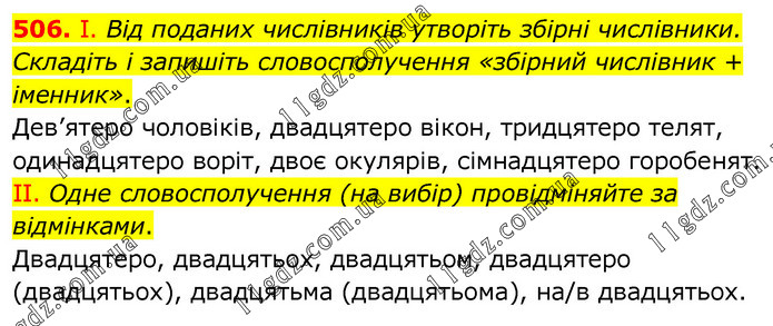 І. Від поданих числівників утворіть збірні числівники. Складіть і запишіть словосполучення «збірний числівник + іменник». Дев’ятеро чоловіків, двадцятеро вікон, тридцятеро телят, одинадцятеро воріт, двоє окулярів, сімнадцятеро горобенят. ІІ. Одне словосполучення (на вибір) провідміняйте за відмінками. Двадцятеро, двадцятьох, двадцятьом, двадцятеро (двадцятьох), двадцятьма (двадцятьома), на/в двадцятьох.