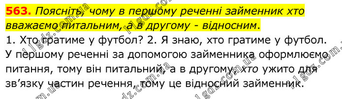 Поясніть, чому в першому реченні займенник хто вважаємо питальним, а в другому - відносним. 1. Хто гратиме у футбол? 2. Я знаю, хто гратиме у футбол. У першому реченні за допомогою займенника оформлюємо питання, тому він питальний, а в другому, хто ужито для зв’язку частин речення, тому це відносний займенник.