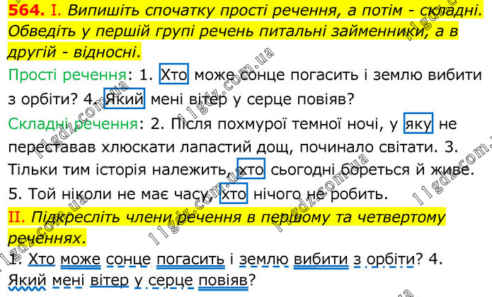 І. Випишіть спочатку прості речення, а потім - складні. Обведіть у першій групі речень питальні займенники, а в другій - відносні. Прості речення: 1. Хто може сонце погасить і землю вибити з орбіти? 4. Який мені вітер у серце повіяв? Складні речення: 2. Після похмурої темної ночі, у яку не переставав хлюскати лапастий дощ, починало світати. 3. Тільки тим історія належить, хто сьогодні бореться й живе. 5. Той ніколи не має часу, хто нічого не робить. ІІ. Підкресліть члени речення в першому та четвертому реченнях. 1. Хто може сонце погасить і землю вибити з орбіти? 4. Який мені вітер у серце повіяв?