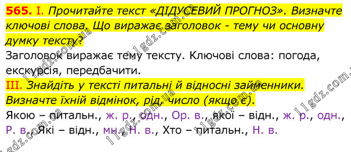 І. Прочитайте текст «ДІДУСЕВИЙ ПРОГНОЗ». Визначте ключові слова. Що виражає заголовок - тему чи основну думку тексту? Заголовок виражає тему тексту. Ключові слова: погода, екскурсія, передбачити. ІІІ. Знайдіть у тексті питальні й відносні займенники. Визначте їхній відмінок, рід, число (якщо є). Якою – питальн., ж. р., одн., Ор. в., якої – відн., ж. р., одн., Р. в., Які – відн., мн., Н. в., Хто – питальн., Н. в.