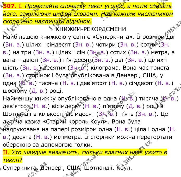 І. Прочитайте спочатку текст уголос, а потім спишіть його, замінюючи цифри словами. Над кожним числівником скорочено надпишіть відмінок. КНИЖКИ-РЕКОРДСМЕНИ Найбільшою книжкою у світі є «Суперкнига». Її розміри дві (Зн. в.) цілих і сімдесят (Зн. в.) чотири (Зн. в.) сотих (Зн. в.) на три (Зн. в.) цілих і сім (Зн. в.) сотих (Зн. в.) метра, а вага – двісті (Зн. в.) п’ятдесят (Зн. в.) дві (Зн. в.) цілих і шість (Зн. в.) десятих (Зн. в.) кілограма. Вона має триста (Зн. в.) сторінок і була опублікована в Денвері, США, у одна (Н. в.) тисяча (Н. в.) дев’ятсот (Н. в.) сімдесят (Н. в.) шостому (Д. в.) році. Найменшу книжку опубліковано в одна (Н. в.) тисяча (Н. в.) дев’ятсот (Н. в.) вісімдесят (Н. в.) п’ятому (Д. в.) році в Шотландії в кількості вісімдесят (Зн. в.) п’ять (Зн. в.). Це дитяча казка «Старий король Коул». Вона була надрукована на папері розміром одна (Н. в.) ціла і одна (Н. в.) десята (Н. в.) міліметра. Її сторінки можна перегортати обережно за допомогою голки. II. Хто швидше визначить, скільки власних назв ужито в тексті? Суперкнига, Денвері, США, Шотландії, Коул.