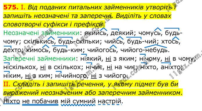 І. Від поданих питальних займенників утворіть і запишіть неозначені та заперечні. Виділіть у словах словотворчі суфікси і префікси. Неозначені займенники: якийсь, деякий; чомусь, будь-чому; скількись, будь-скільки; чийсь, будь-чий; хтось, дехто; кимось, будь-ким; чийогось, чийого-небудь. Заперечні займенники: ніякий, ні з яким; нічому, ні в чому; ніскількох, ні в скількох; нічиє, ні на чиє; ніхто, аніхто; ніким, ні з ким; нічийного, ні з чийого. ІІ. Складіть і запишіть речення, у якому підмет був би виражений неозначеним або заперечним займенником. Ніхто не побачив мій сумний настрій.