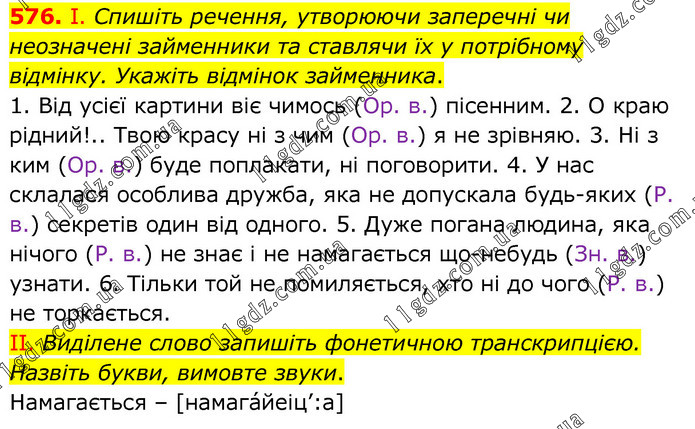 І. Спишіть речення, утворюючи заперечні чи неозначені займенники та ставлячи їх у потрібному відмінку. Укажіть відмінок займенника. 1. Від усієї картини віє чимось (Ор. в.) пісенним. 2. О краю рідний!.. Твою красу ні з чим (Ор. в.) я не зрівняю. 3. Ні з ким (Ор. в.) буде поплакати, ні поговорити. 4. У нас склалася особлива дружба, яка не допускала будь-яких (Р. в.) секретів один від одного. 5. Дуже погана людина, яка нічого (Р. в.) не знає і не намагається що-небудь (Зн. в.) узнати. 6. Тільки той не помиляється, хто ні до чого (Р. в.) не торкається. ІІ. Виділене слово запишіть фонетичною транскрипцією. Назвіть букви, вимовте звуки. Намагається – [намага́йеіц’:а]