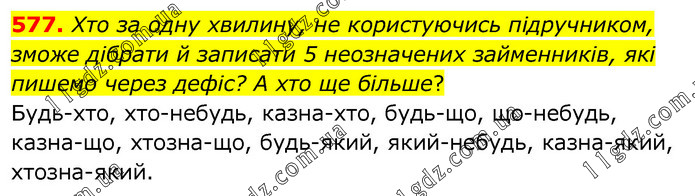 Хто за одну хвилину, не користуючись підручником, зможе дібрати й записати 5 неозначених займенників, які пишемо через дефіс? А хто ще більше? Будь-хто, хто-небудь, казна-хто, будь-що, що-небудь, казна-що, хтозна-що, будь-який, який-небудь, казна-який, хтозна-який.