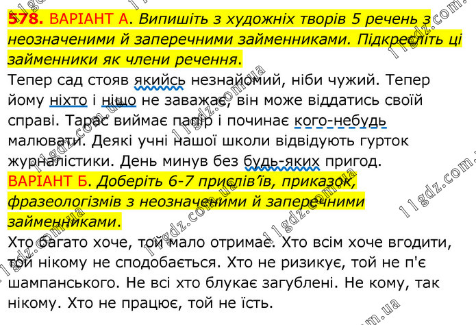 ВАРІАНТ А. Випишіть з художніх творів 5 речень з неозначеними й заперечними займенниками. Підкресліть ці займенники як члени речення. Тепер сад стояв якийсь незнайомий, ніби чужий. Тепер йому ніхто і ніщо не заважає, він може віддатись своїй справі. Тарас виймає папір і починає кого-небудь малювати. Деякі учні нашої школи відвідують гурток журналістики. День минув без будь-яких пригод. ВАРІАНТ Б. Доберіть 6-7 прислів’їв, приказок, фразеологізмів з неозначеними й заперечними займенниками. Хто багато хоче, той мало отримає. Хто всім хоче вгодити, той нікому не сподобається. Хто не ризикує, той не п'є шампанського. Не всі хто блукає загублені. Не кому, так нікому. Хто не працює, той не їсть.
