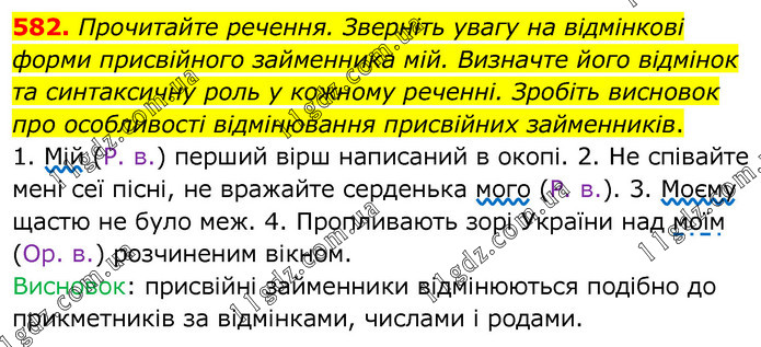 Прочитайте речення. Зверніть увагу на відмінкові форми присвійного займенника мій. Визначте його відмінок та синтаксичну роль у кожному реченні. Зробіть висновок про особливості відмінювання присвійних займенників. 1. Мій (Р. в.) перший вірш написаний в окопі. 2. Не співайте мені сеї пісні, не вражайте серденька мого (Р. в.). 3. Моєму щастю не було меж. 4. Пропливають зорі України над моїм (Ор. в.) розчиненим вікном. Висновок: присвійні займенники відмінюються подібно до прикметників за відмінками, числами і родами.